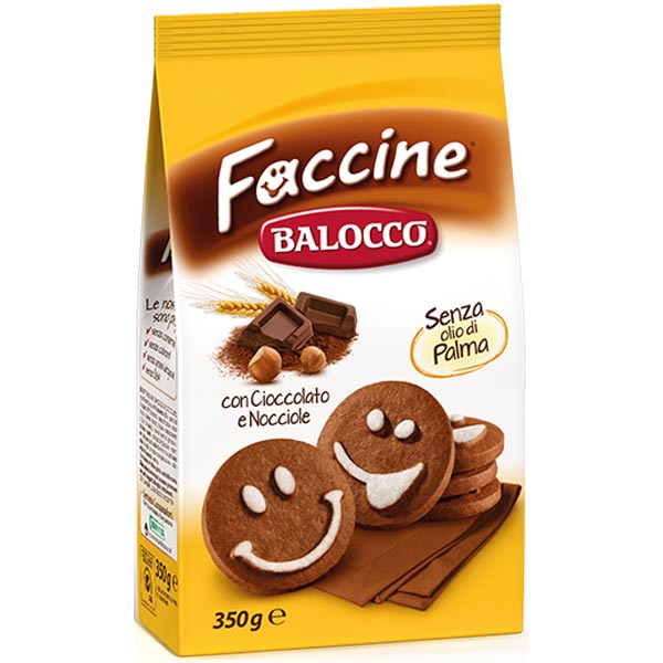 Rich in chocolate and hazelnuts, Faccine is the ideal shortbread to start the day with a smile. It is prepared without palm oil, preservatives, dyes, or hydrogenated fats.