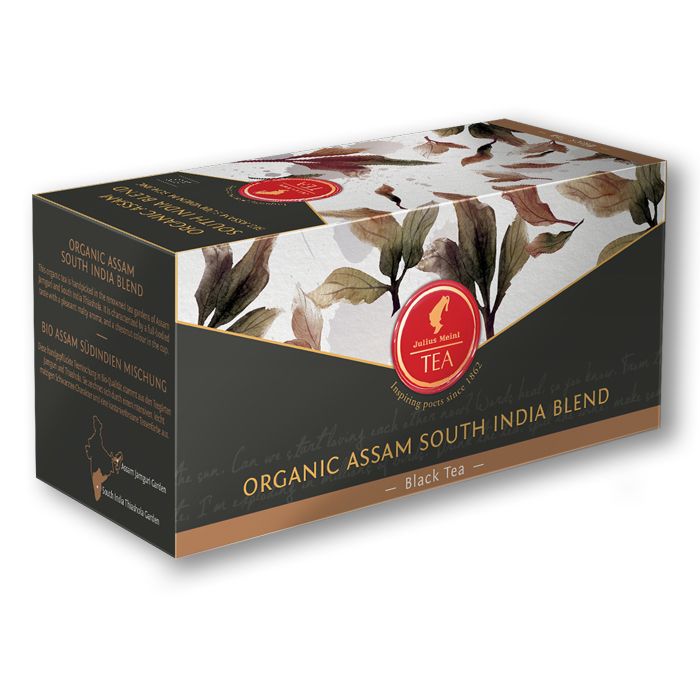 Organic Assam South India blend: This organic black tea is handpicked in the renowned tea gardens of Assam Jamguri and South India Thiashola. It is characterized by a full-bodied taste with a pleasant malty aroma, and a chestnut colour in the cup.