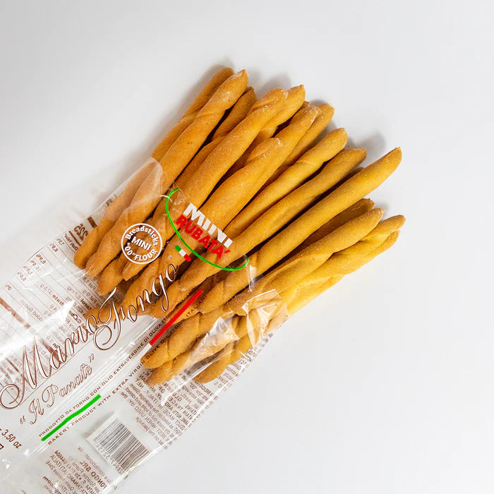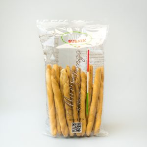 The Rubatà Breadksticks are a delicious crunchy snack hailing from Piemontese tradition. Rubatà means "fallen" in Piemontese dialect, explaining the irregular and knotty shape of these breadsticks that are made with only a few, high-quality ingredients, like water, flour, salt, lard, yeast, and 100% Italian Extra Virgin Olive Oil.