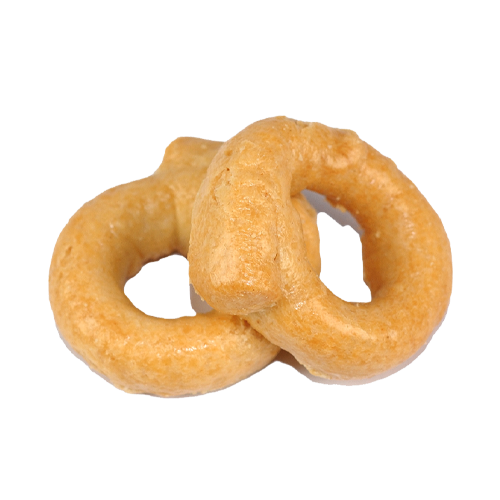 Produced with a rounded donut shape of about 3.5 cm. Natural smell of bread, crumbly texture, savory cookie taste, golden color with brownish shades.
